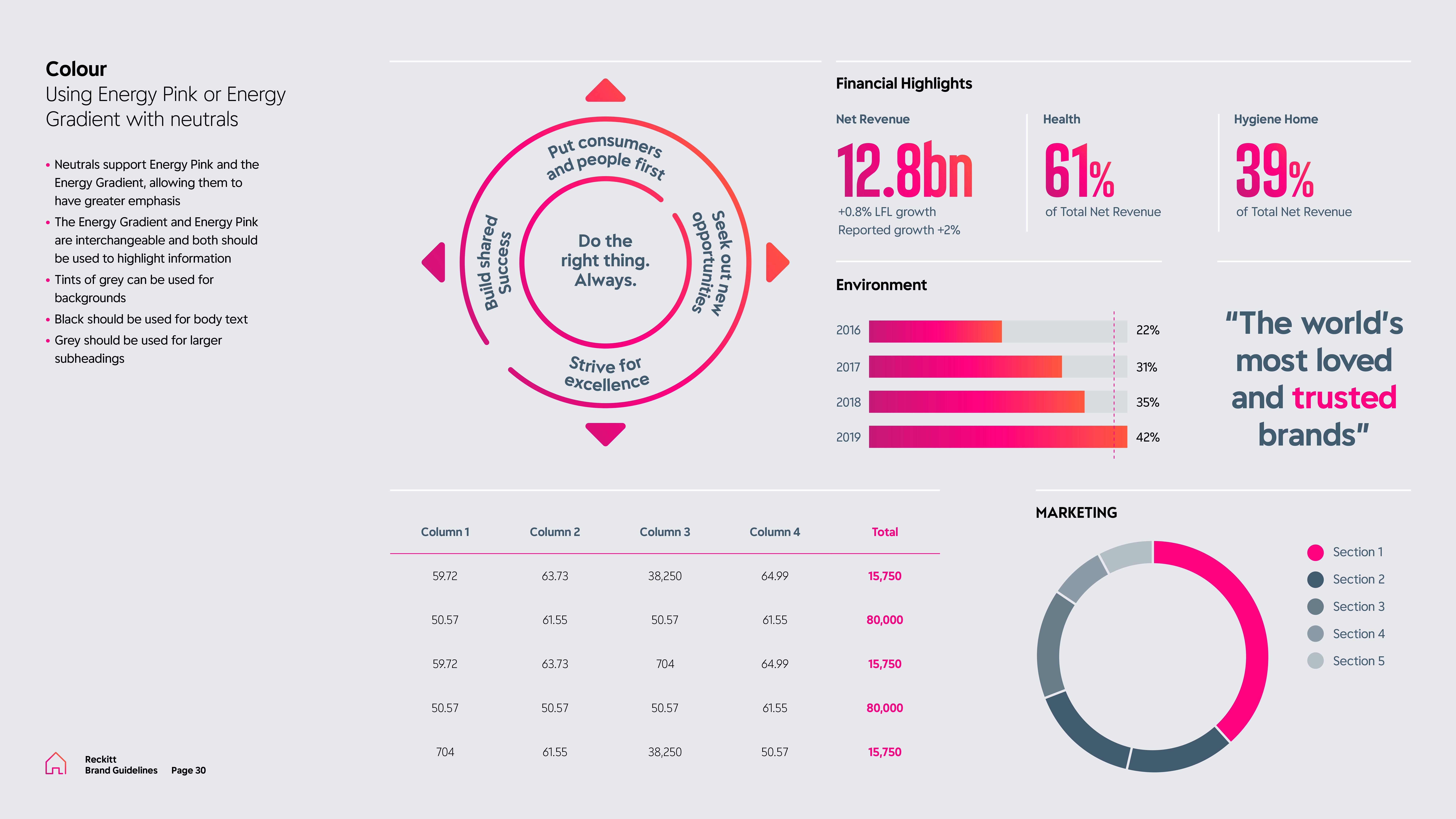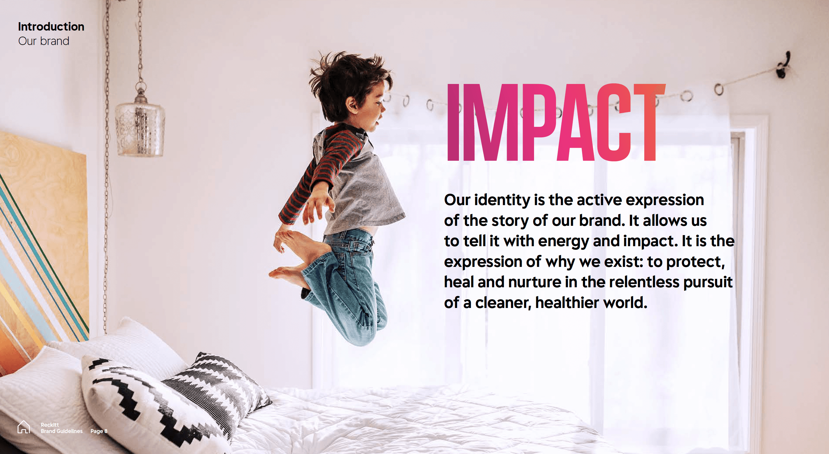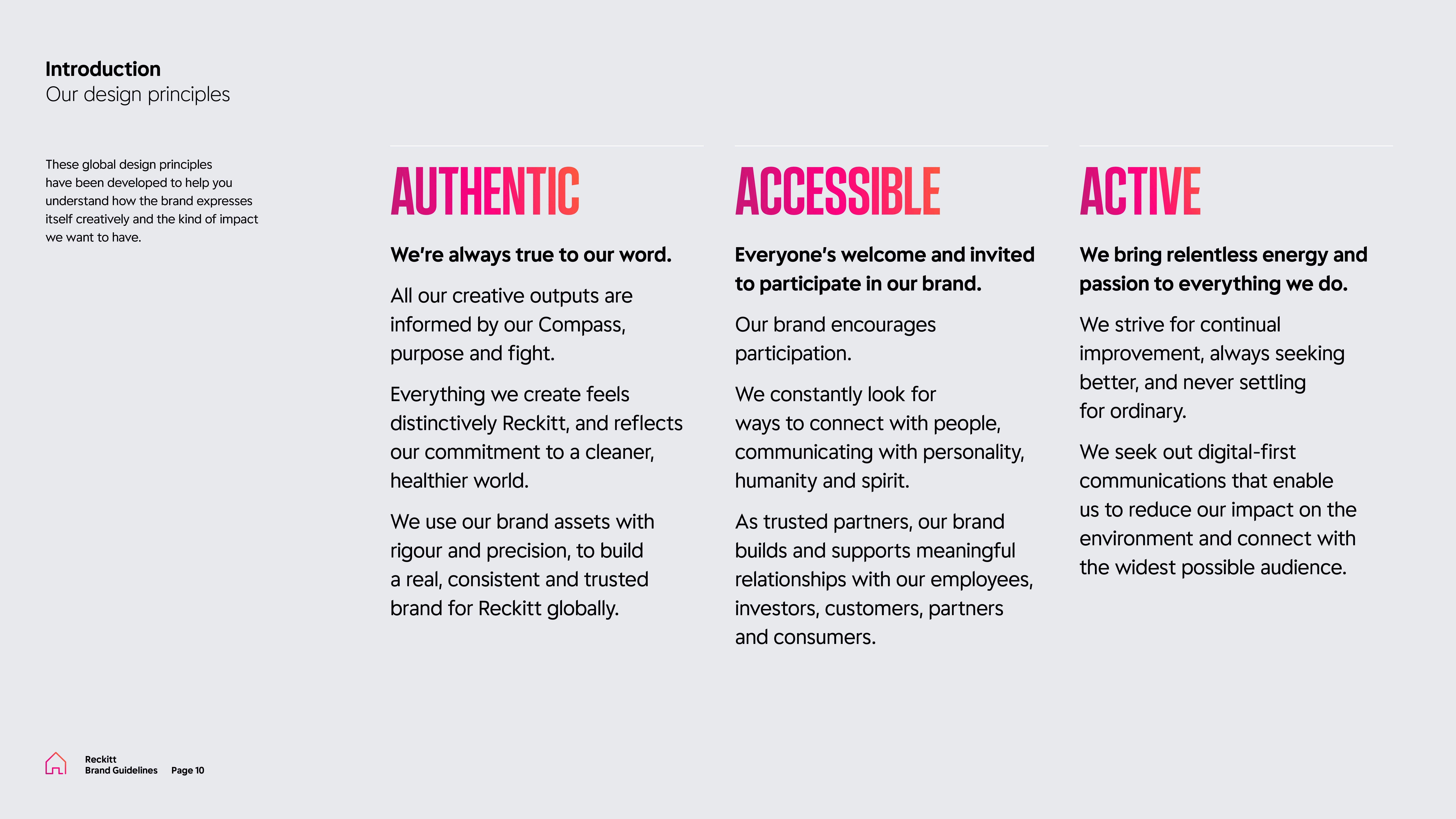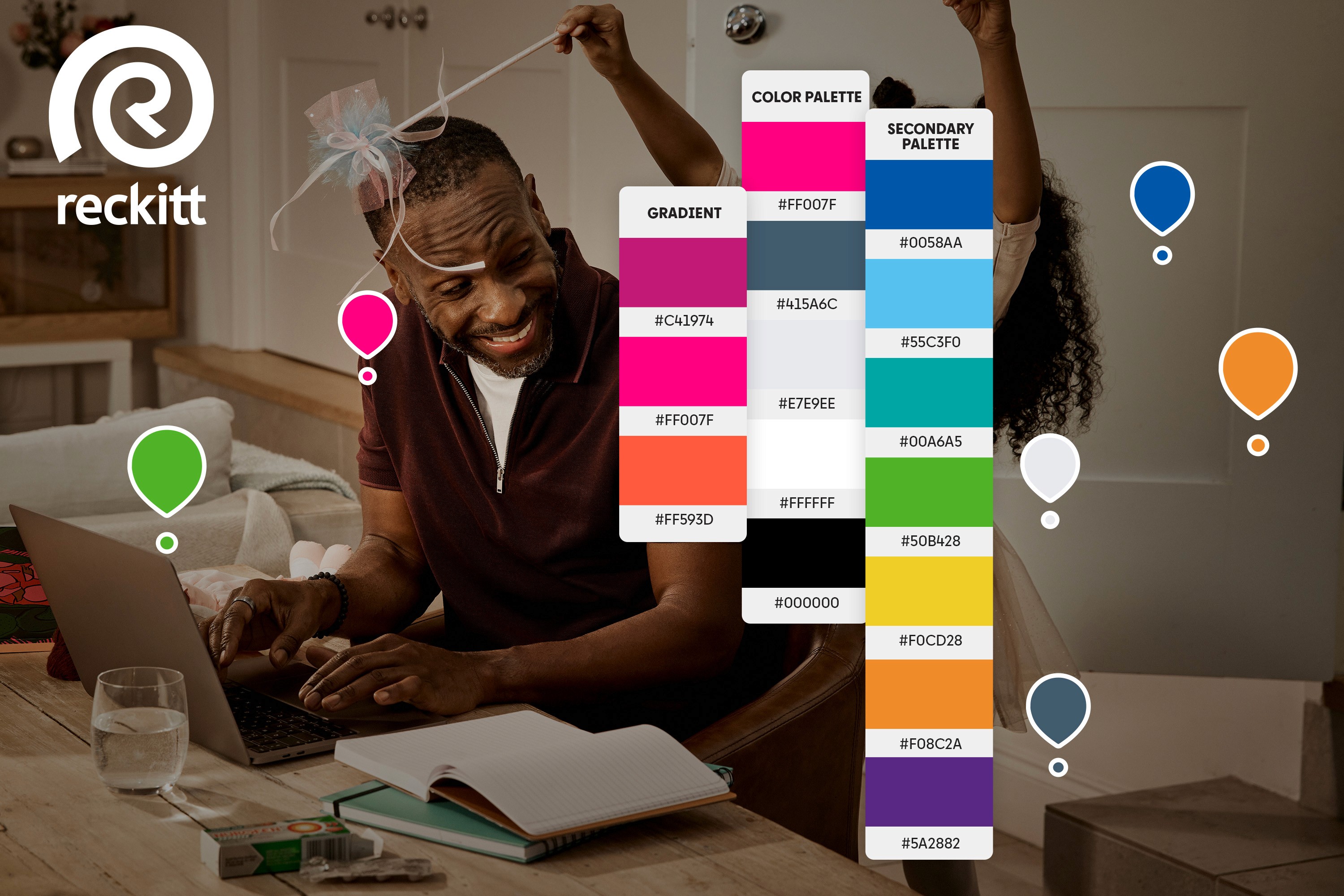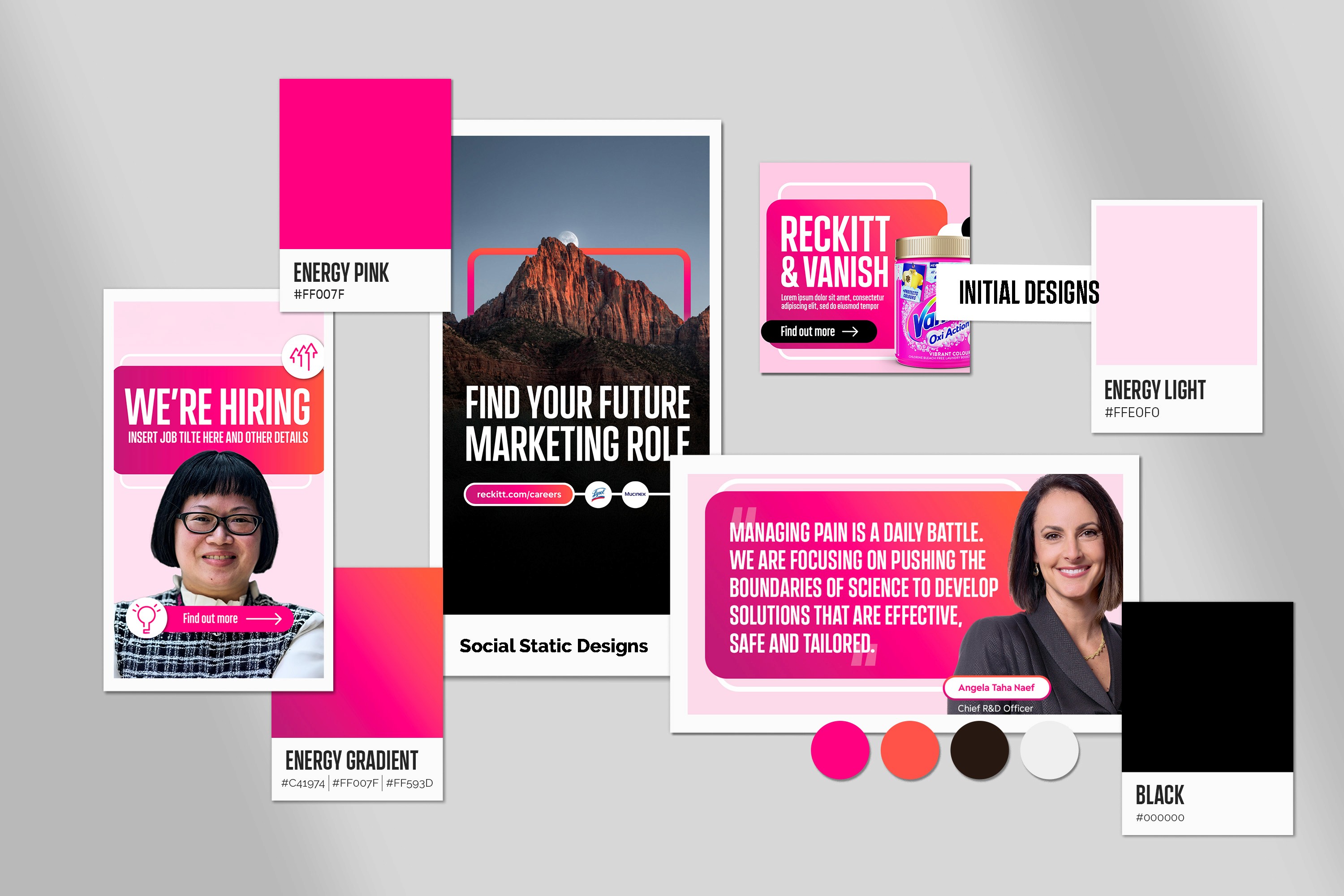 Reckitt's main value proposition is to protect, heal and nurture in the relentless pursuit of a cleaner, healthier world. They have 3 core design principles which are authentic, accessible and active. Their colour palette is distinctive and recognisable signifying their relentless energy. The bold pink and the Reckitt gradient are important traits that make Reckitt stand out in the market and I have utilised that as the foundation for lot of my work and design thinking.