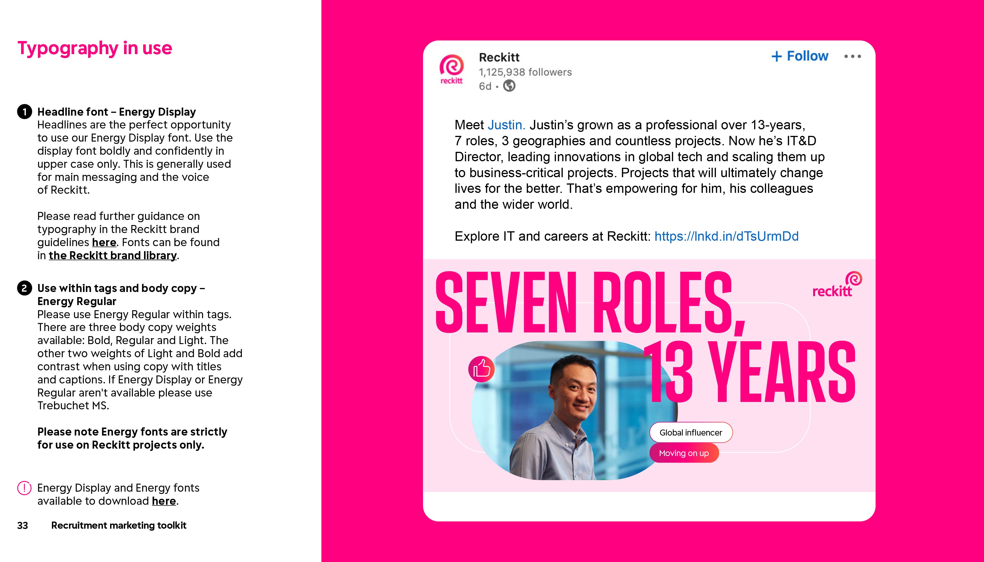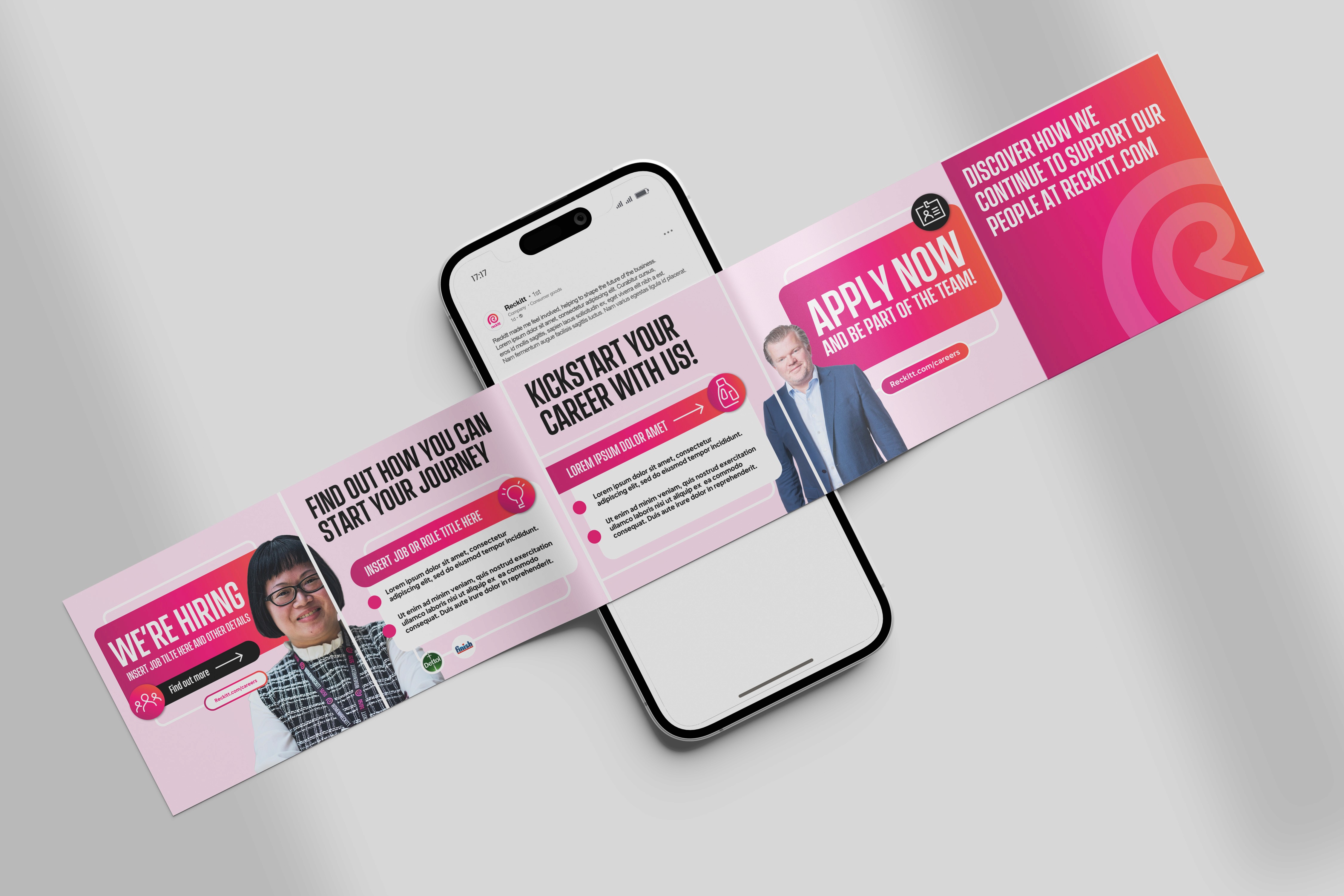 This brief came to my desk off the back of all the new Recruitment Marketing branding we did for Reckitt. The brief was to spruce up an old Reckitt branded version of the flyer and incorporate latest elements and branding that feel more relevant and on-brand. I used fresh colours, devices and imagery that allowed the content and staff shine in the layouts. The spread was sat in an internal staff magazine that was sent out to suppliers, potential new hires as well as graduates and students looking to start their career at Reckitt.