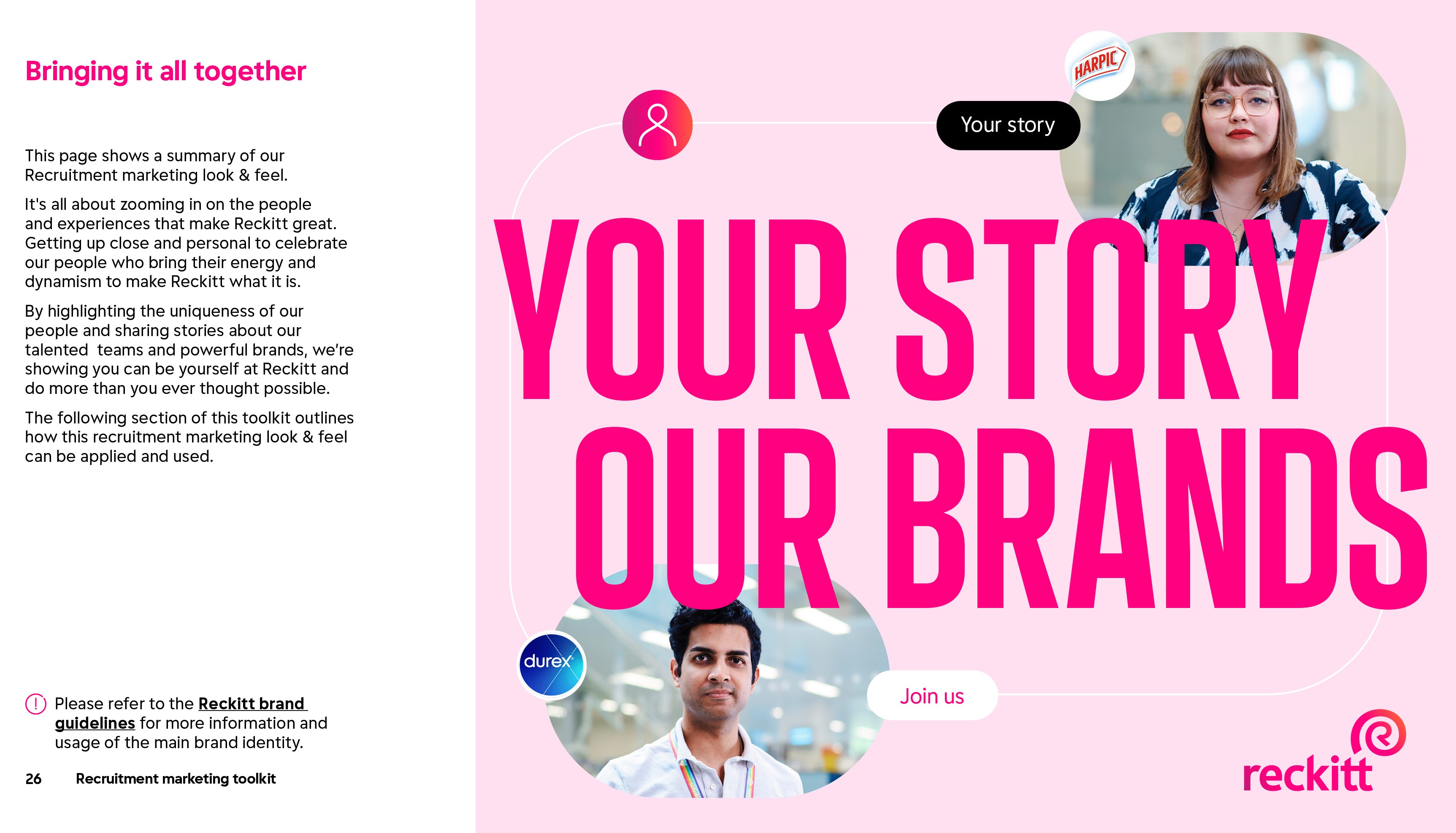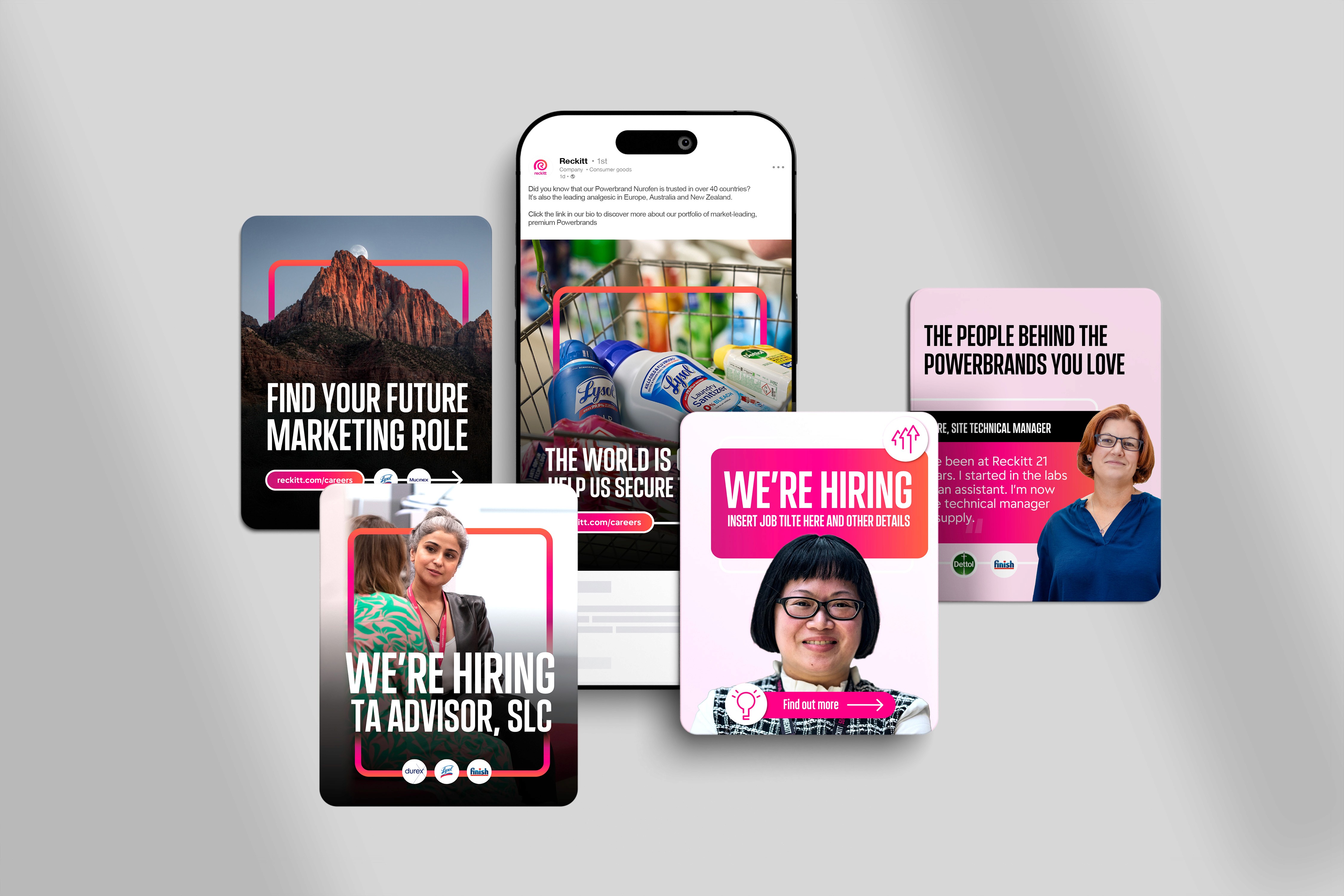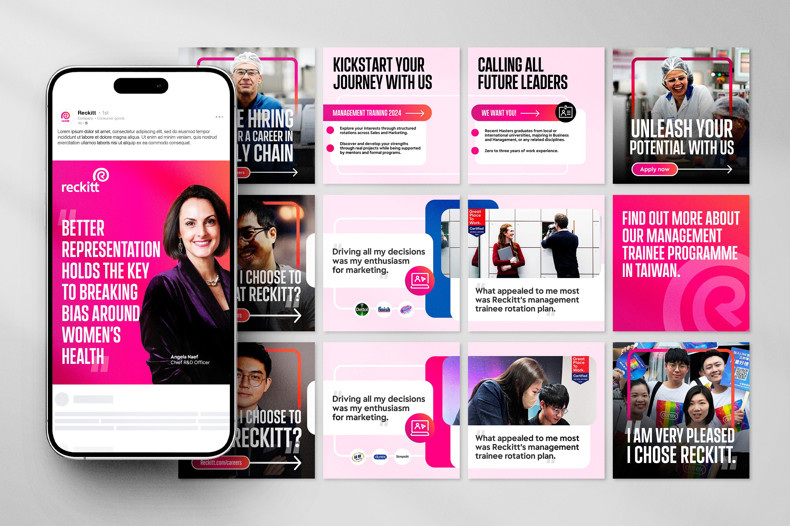 Alongside our global overhaul of all of Reckitt's content on socials, another challenge was posed to us. This related to their Talent Acquisition division and their position as an employer to the general public. Reckitt was struggling to find a brand thread and identity that tied their employees' stories and staffing requirements together. A singular brand aesthetic and tone of voice that was approachable and bold. We were tasked to maintain employee morale as the company restructures its portfolio and strengthen Reckitt as a leading Health & Hygiene business to attract and retain the best talent (from science & R&D to manufacturing).