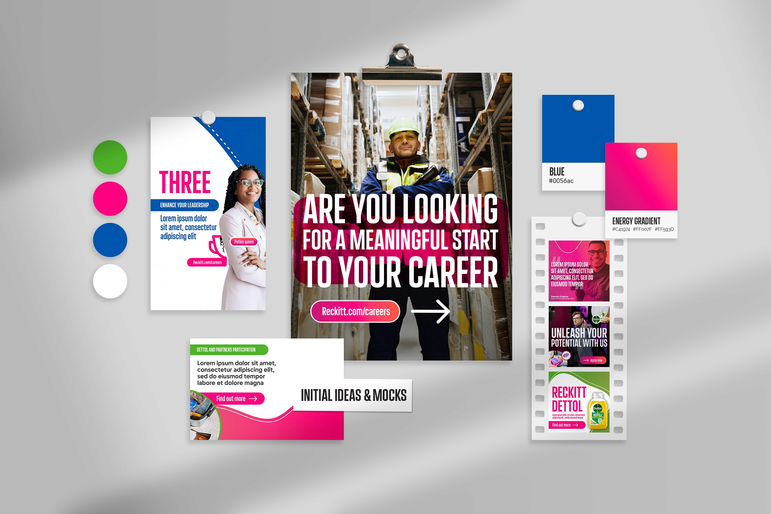 Working with the global team in the UK we needed to build an always on content strategy reflecting Reckitt’s values and sharpened portfolio, which local talent teams in multiple different markets could adapt. Our task was to create a visual playbook which ensures consistent yet flexible execution digitally and OOO (making it easy for local markets). Develop a holistic strategy for talent acquisition and a series of recruitment marketing campaigns and work closely with local markets for liaison and effective execution. My task as the main creative involved was to Art-Direct the overall look and feel of the assets. Establish brand principles and colours that associate back to their RM content. I single-handedly, came up with concepts, tested different colours, tones and devices. These were some of the initial concepts.