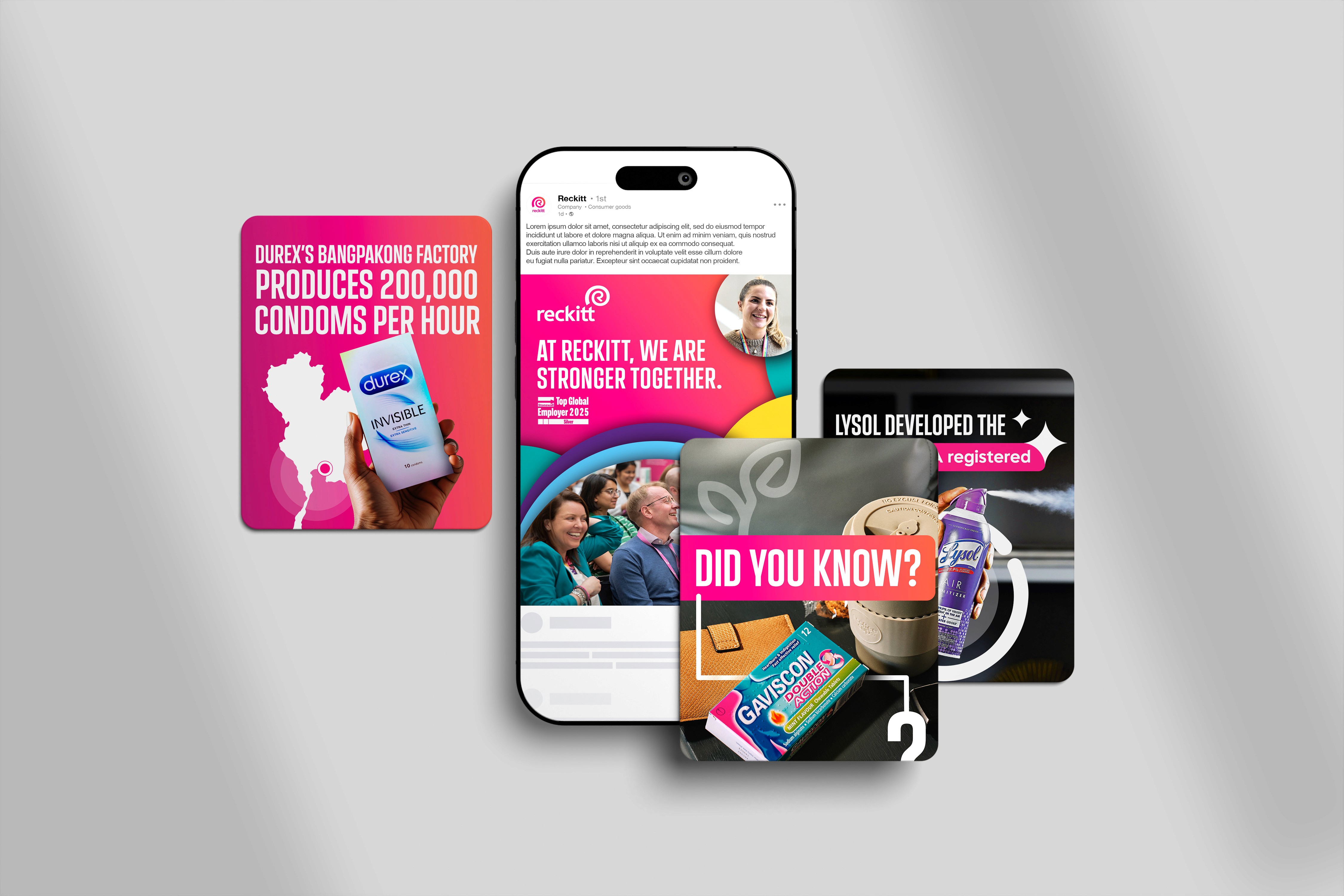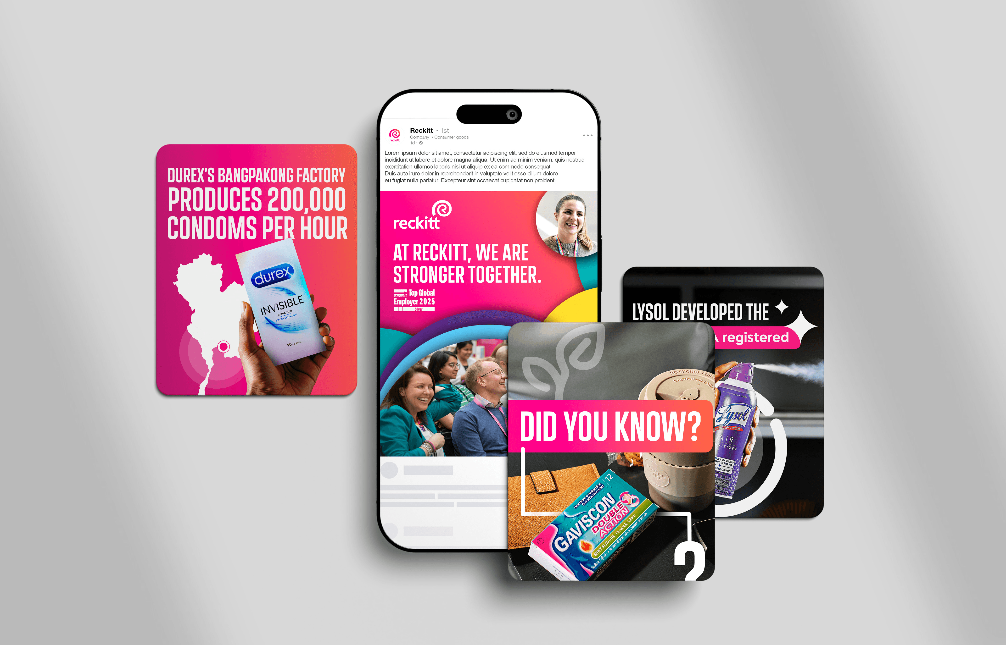 We Pitched and won the B2B division of Reckitt’s marketing and visual communication channels in 2023. They came to our agency with a problem of visibility and awareness as a brand that should be a household name. Their goals were not only to increase awareness in the wider market, but also to educate their audiences about how their brands play an integral part in their day-to-day lives. We stepped in to improve their corporate social communications, social media content as well as help reach wider audiences. Our responsibilities over the course of 12 months also grew into improving their Recruitment Marketing and Talent acquisition division.
