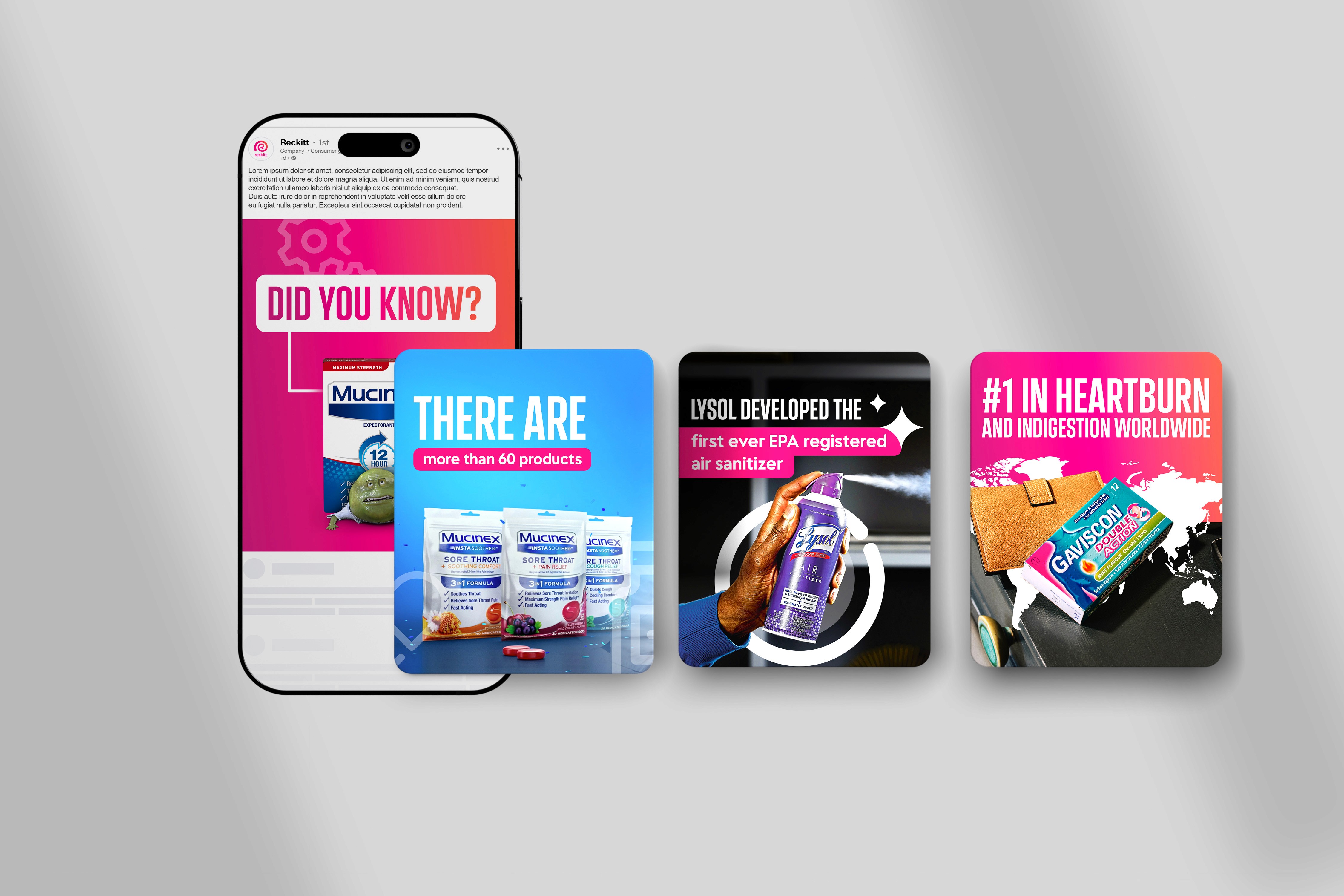 Since our overhaul of the Reckitt channels and brand refresh, the brand has seen some outstanding results across the board. Engagement rates on posts have significantly climbed and people are more aware of Reckitt as an entity beyond the name. Our highest performing posts range from a 32-34% engagement rate with 60,000+ impressions/post. We have also successfully educated consumers, future talent, suppliers and competitors about how Reckitt continues to innovate through it's products, initiatives and sprawling employment benefits/opportunities. These were some of my best performing designs across social and digital channels.